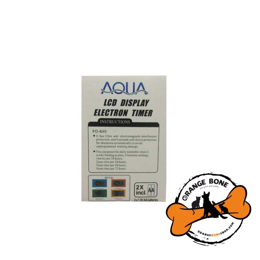 دستگاه غذا ریز آکواریوم برند آکوا مدل FD640 دارای یک مخزن با قابلیت تنظیم میزان خروجی غذا، صفحه دیجیتال تنظیم دفعات و زمان غذادهی و یک پایه نگهدارنده است که آن را به شیشه آکواریوم متصل می کند. این دستگاه با دو عدد باتری قلمی کار می کند و قابلیت غذا دادن به ماهی ها به صورت دو مرتبه در روز را دارا می باشد.