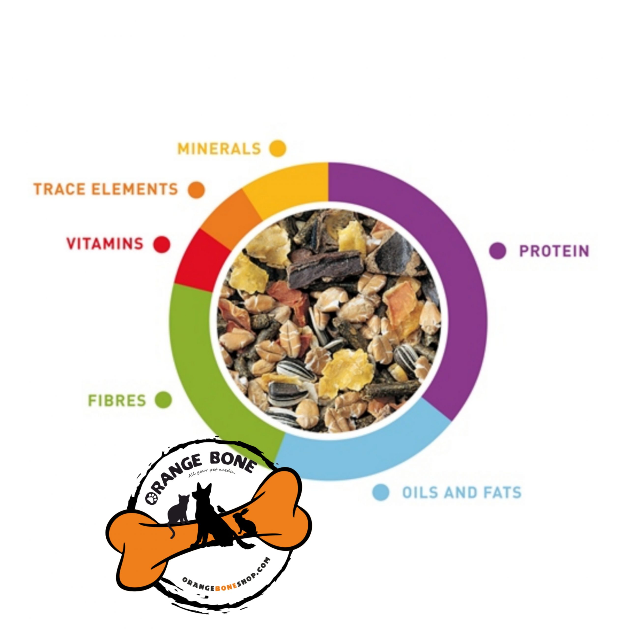 غلات، مشتقات گیاهی (10% یونجه)، میوه ها (10% خرنوب)، سبزیجات (5% عدس، 2% هویج)، دانه ها (شامل آفتابگردان)، مواد معدنی، عصاره پروتئین های گیاهی