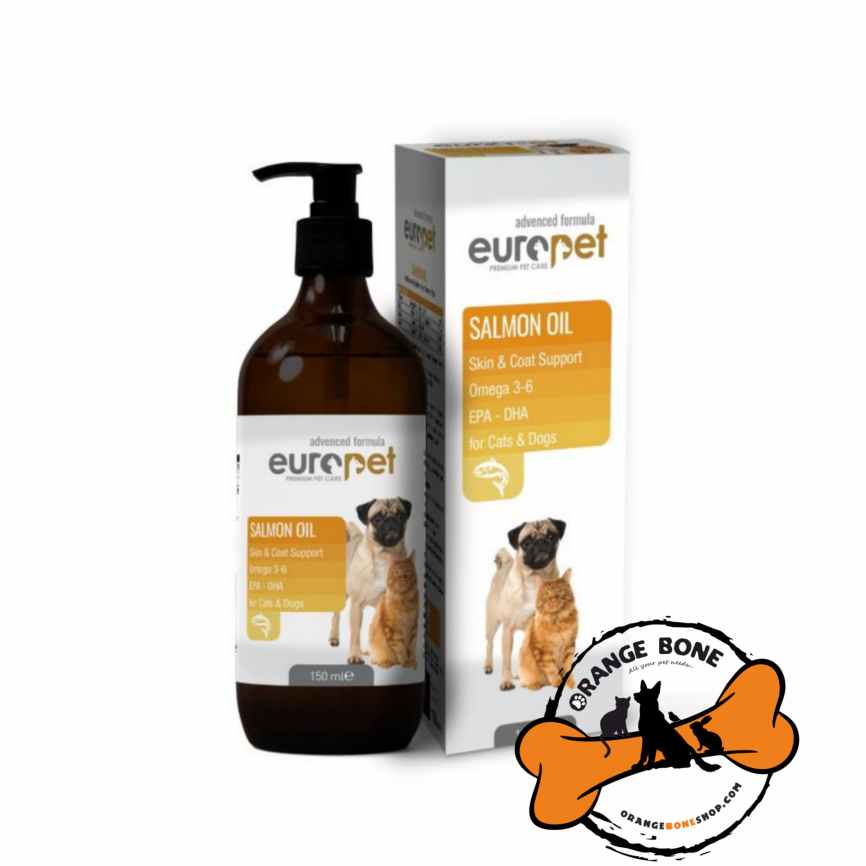 از دلایل ریزش مو در سگ ها و گربه کمبود امگا 3 و امگا 6 است، بهترین منبع تامین امگا هم روغن های ماهی هستند. روغن ماهی سالمون یوروپت در حجم 150 میلی لیتر تولید می شود. این روغن طبیعی را می توانید روزانه اندکی روی غذای خانگی و یا غذای خشک سگ و گربه خود بریزید. وجود امگا3 و 6 باعث تقویت پوست و مو حیوان شده، به براق شدن آن کمک می کند و ریزش مو را کنترل می نماید. EUROPET SALMON OIL منبع غنی از ویتامین A و D است و به طور کلی برای سلامت سگ و گربه بسیار مفید خواهد بود.